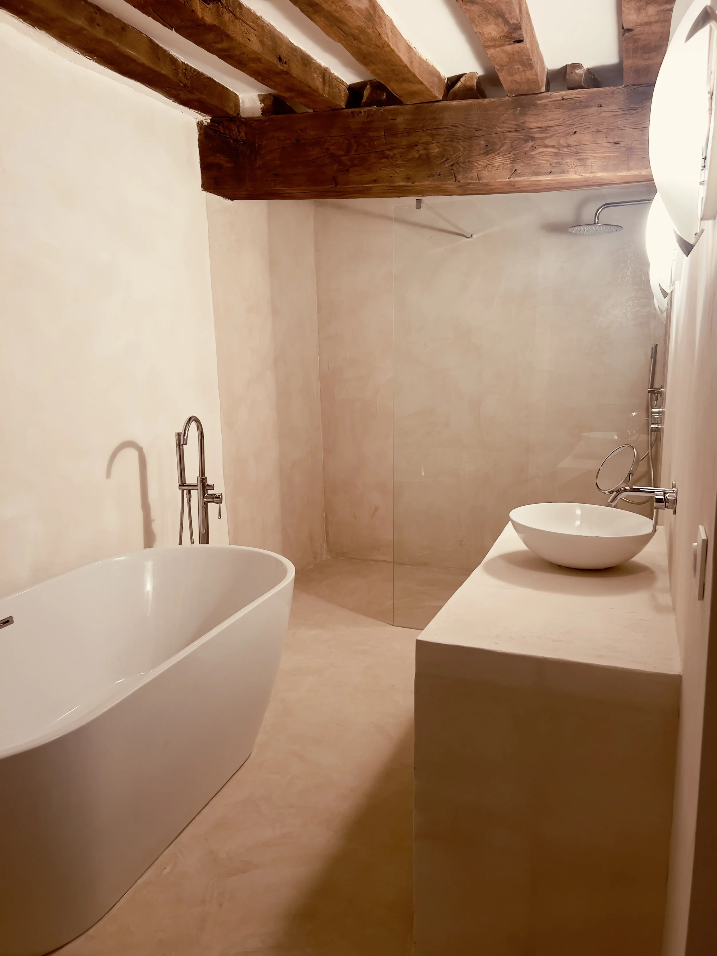 Step through the archway into a private sanctuary. A deep soaking tub and walk-in rain shower sit against smooth lime-plastered walls, designed for both quiet ritual and indulgance. Soft light and simple lines turn everyday moments into something restorative.